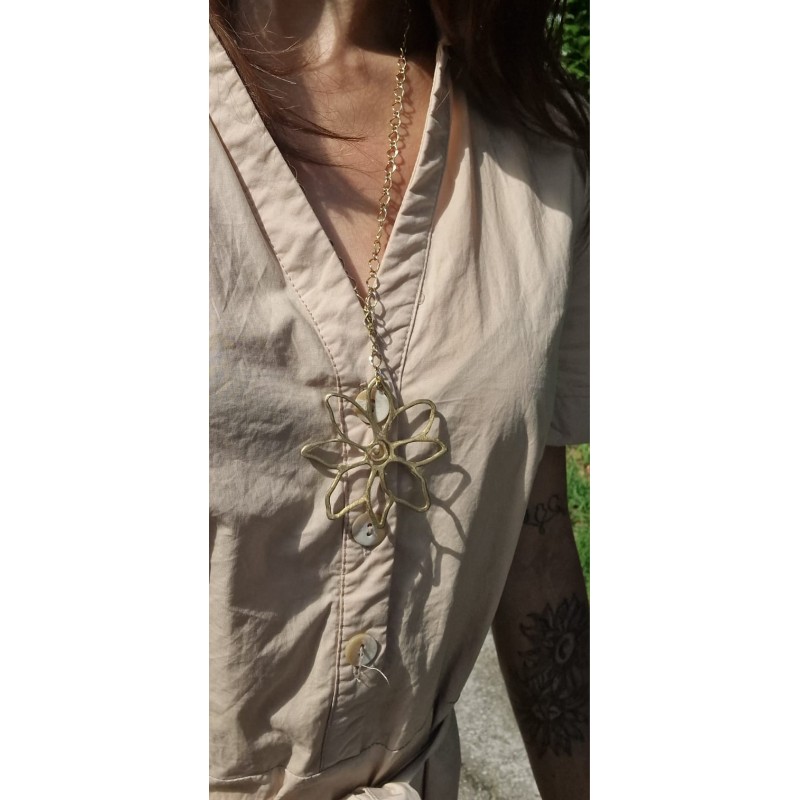 Splendida collana in ottone, il ciondolo a girasole è elegante e luminoso, è perfetto per aggiungere un tocco di calore e stile a ogni outfit. Un dettaglio Unico che cattura l'attenzione.